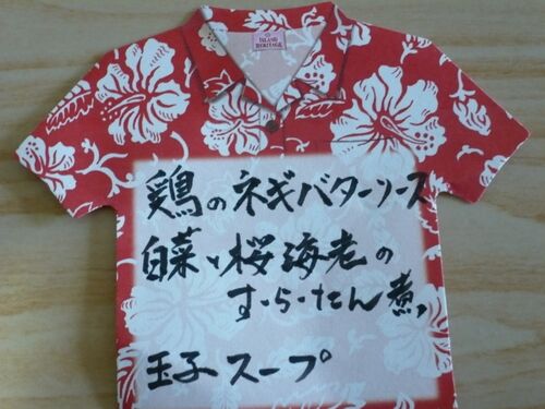 メニュー アロハシャツメモ第5弾! 今日の一品 鶏のネギバターソース まんちゃさんのメニューに最近少し変化が。これなどバターを使ってあって少し洋風です。いろいろ試していただいてうれしいです。とはいえネギがのってるところは「まんちゃさん風」。(なんだか…