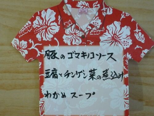 メニュー アロハシャツメモ第6弾! 今日の一品 豚のゴマきのこソース まんちゃさんのご説明では、「豚肉を軟らかく煮て・・・」ということでした。いただいてみたらほんとにきめが細かくてやわらかくて。どうしたらこんな風になるのでしょう?ゴマソースのあっさりした和…