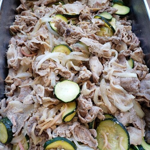 豚肉とズッキーニの新生姜炒め コールラビときゅうりの塩昆布和え 小松菜、えのき、生揚げのみそ汁