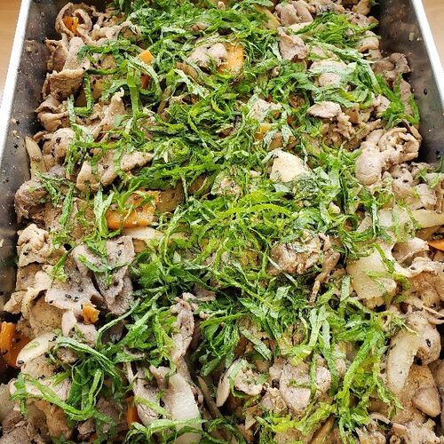 豚肉とごぼう、人参のゴマソテー大葉のせ キャベツとフルーツトマト、ブロッコリーのあさりマリネ ほうれん草、きのこ、生揚げのみそ汁